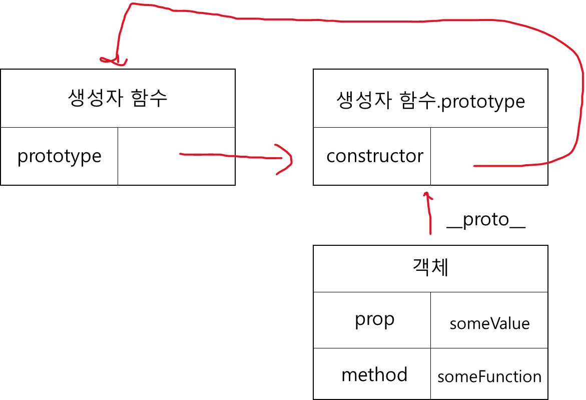 모든 객체는 하나의 프로토타입을 갖고, 모든 프로토타입은 생성자 함수와 연결되어 있다.