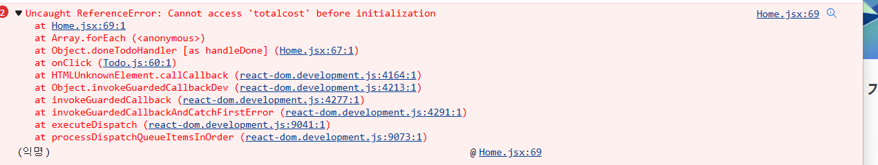 객체의 totalcost를 위쪽에 사용하는데 아래 let으로 섢언했었다. 이를 var로 바꿔도 되지만, 그보단 위쪽에서 let으로 다시 선언하는 방법을 택했다.